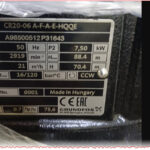 The pump in the photo is clearly identified on its nameplate as a Grundfos CR20-06 A-F-A-E-HQQE with a 7.50 kW motor operating at 50 Hz and about 2919 rpm.